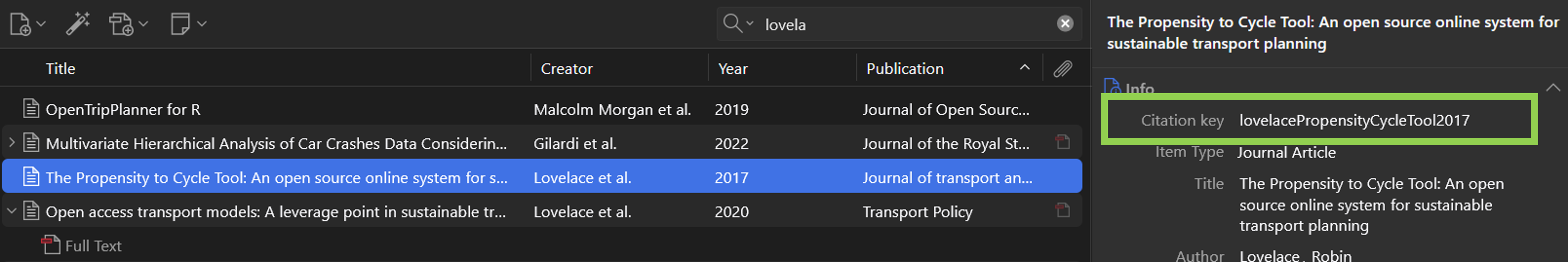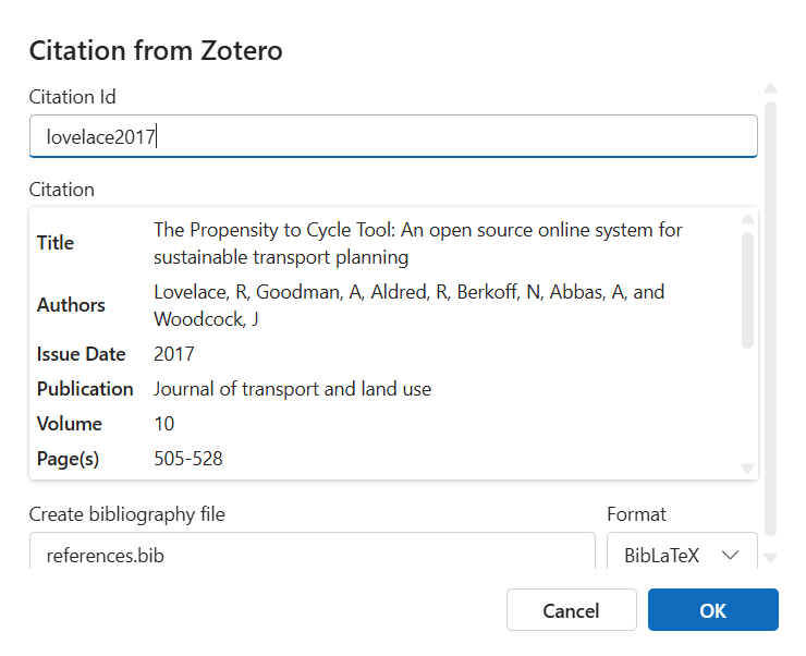Citations to reference external sources such as journal articles, books, or websites can also be used in Quarto. They can be added manually, but we recommend integrating Zotero into your workflow. This integration is already set up for all IDEs in the visual editor.